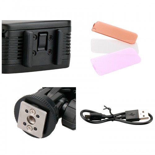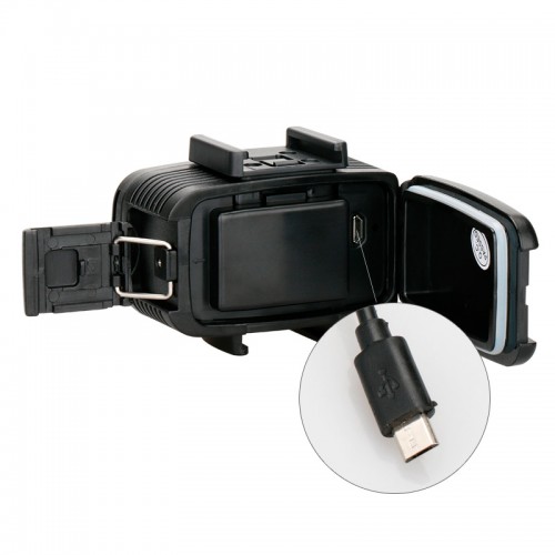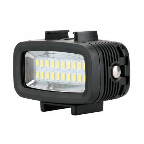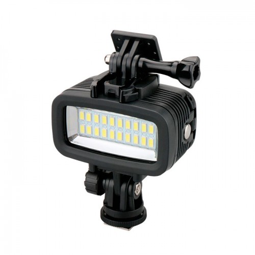 Герметичный подводный фонарь из 20 светодиодов (LED) рекомендуется для съёмок под водой на глубине до 40 метров, в тёмное время суток или установку на велосипед (защита от дождя). Крепление фонаря стандарта GoPro и типа "холодный башмак". В комплекте 2 фильтра для коррекции цвета (красный и пурпурный) и рассеиватель для создания более мягкого пучка света. Аккумулятор (встроенный) на 1900 mAh.