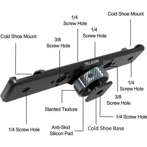 Крепление удлинитель кронштейн на два башмака, четыре резьбы 1/4 дюйма и две резьбы 3/8 дюйма. В нижней части ножки, которая устанавливается в камеру, предусмотрена резьба 1/4 " дюймов в качестве альтернативного варианта крепления для крепления на мини-штативы и другие опоры.