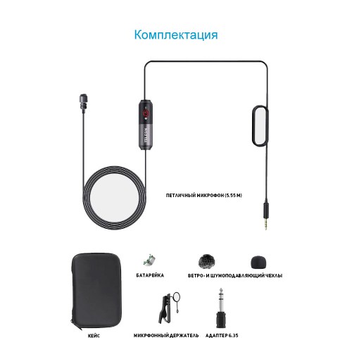 Профессиональный всенаправленный микрофон с функцией шумоподавления обеспечивает отличное качество звука. Разъем 3.5 мм плюс адаптер на 6.35 мм. В комплекте кабель 5.5 метра.