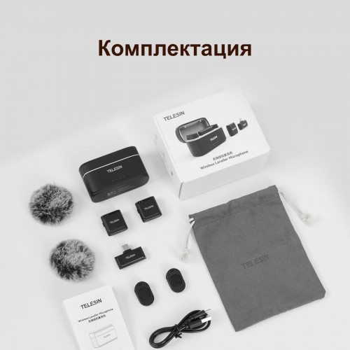 В комплект входят два микрофона, ресивер, зарядный кейс, магнитные клипсы, ветрозащита, кабель для зарядки и сумка для хранения