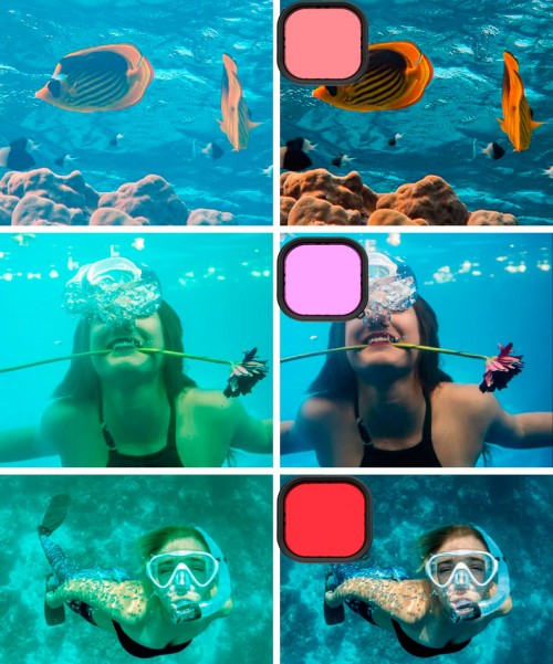 Фильтры исправляют цветопередачу в воде и устанавливаются на аквабокс Telesin. их можно использовать на глубине от 5 до 25 метров.