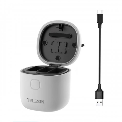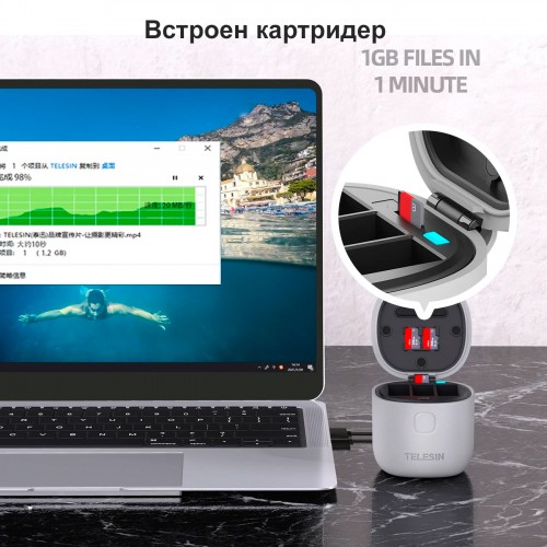 Зарядное устройство для GoPro HERO 12, 11, 10 и 9 Telesin Allin Box. Данное устройство позволяет заряжать одновременно до трёх аккумуляторов и даже передавать файлы с карты памяти на ваш компьютер. Есть дополнительные слоты для хранения карт памяти. Устройство комплектуется кабелем зарядки type-c.